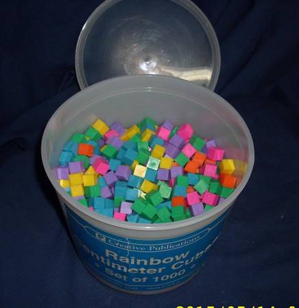 1 Tub of Color Cubes or Cubed Power Blocks: Light Purple:16 Dark Purple: 46 Green: 67 Blue: 60 Light Red: 10 Dark Red: 40 Orange: 63 Yellow: 59 Dimensions: Estimate: 3/4" to 1 " per side, likely...